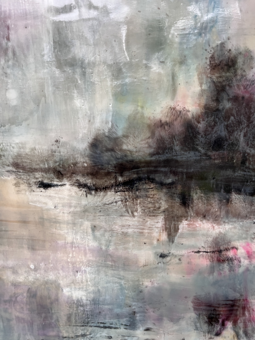 Solid encaustic wax and oil on wood in bespoke oak frame. Abstract landscape painting.